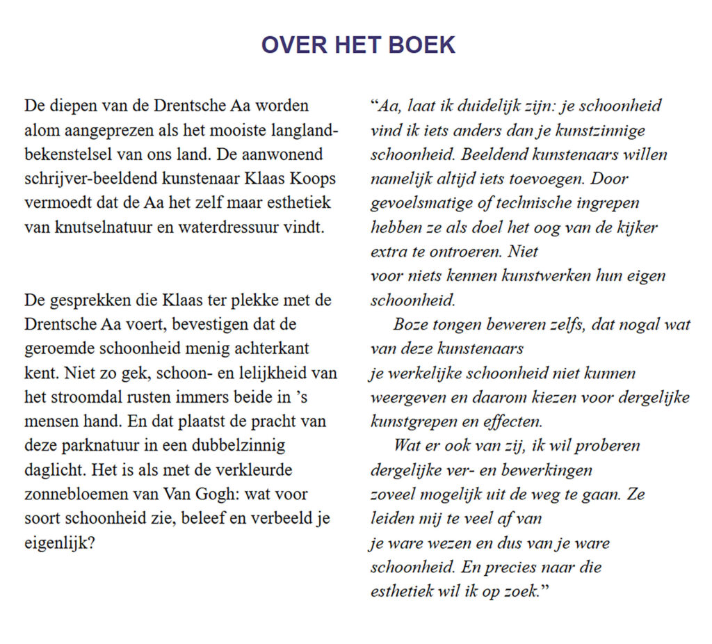 In gesprek met de Aa beschrijft een kunstzinnige zoektocht naar de actuele schoonheid van de Drentsche Aa met behulp van proza, poëzie en bewerkte schetsen.