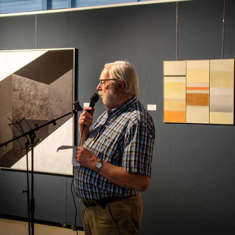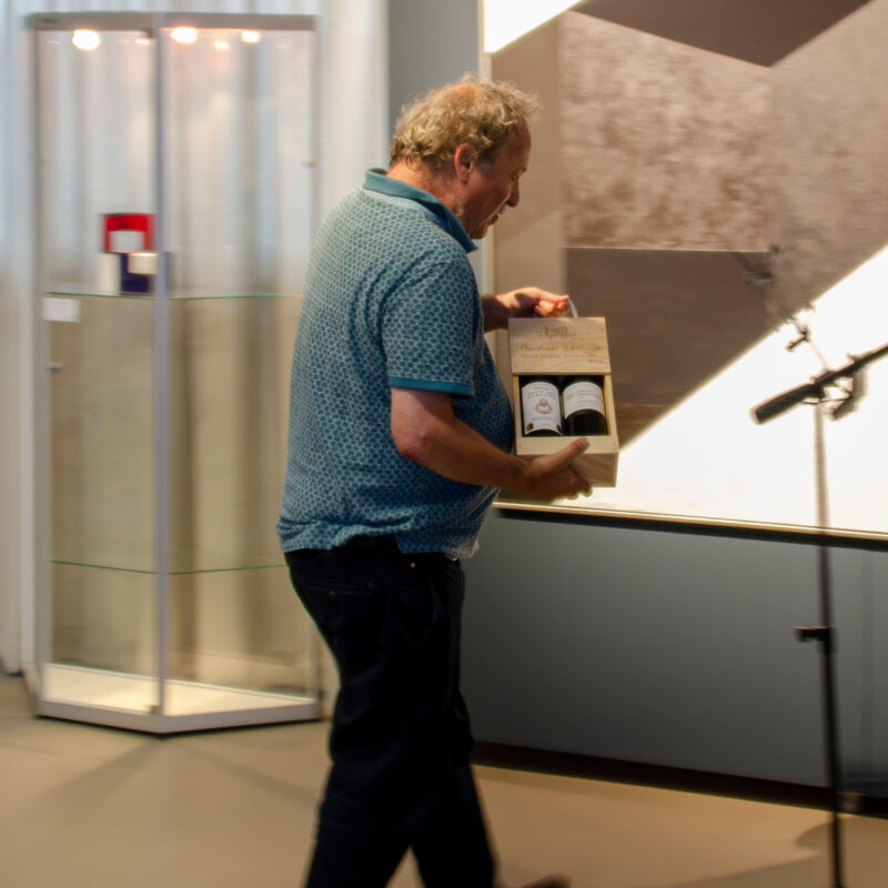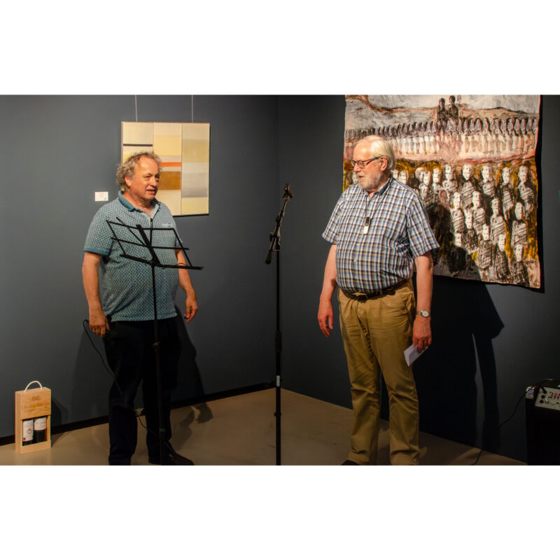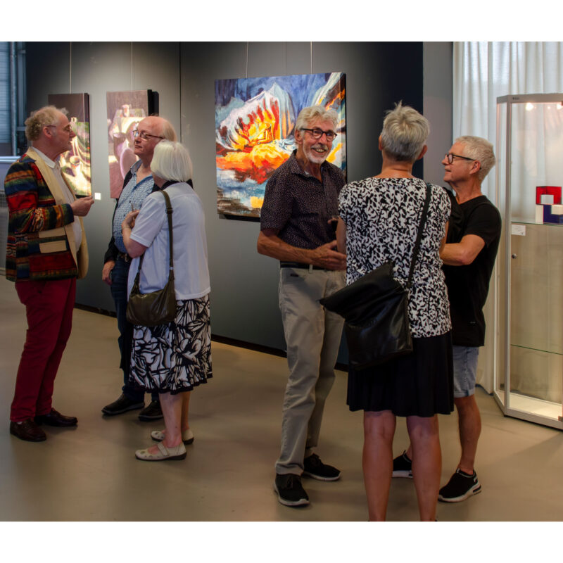 Vrijdag 7 juli 2023 opende vicevoorzitter Jan Jaap Heij de expositie Young Blood. Maar voordat hij daartoe overging zette hij onze oud voorzitter Mark Lisser eerst even ‘in het zonnetje’. Hij bedankte Mark voor de enthousiaste en energieke manier waarop hij het DSG met veel elan in de belangstelling heeft gezet. Door de beperking van het lidmaatschap iets te verruimen van ‘wonen in Drenthe’ naar ‘een band hebben met Drenthe’ is de vereniging behoorlijk gegroeid in ledenaantal. Door daarnaast ook actief op zoek te gaan naar potentiële leden die andere kunstvormen beoefenen is er veel meer variatie in het werk van het DSG. Dit komt in deze expositie goed tot zijn recht met de geometrische objecten van Henk Rusman. Als blijk van waardering overhandigde Alfred Krans een kistje rode wijn.