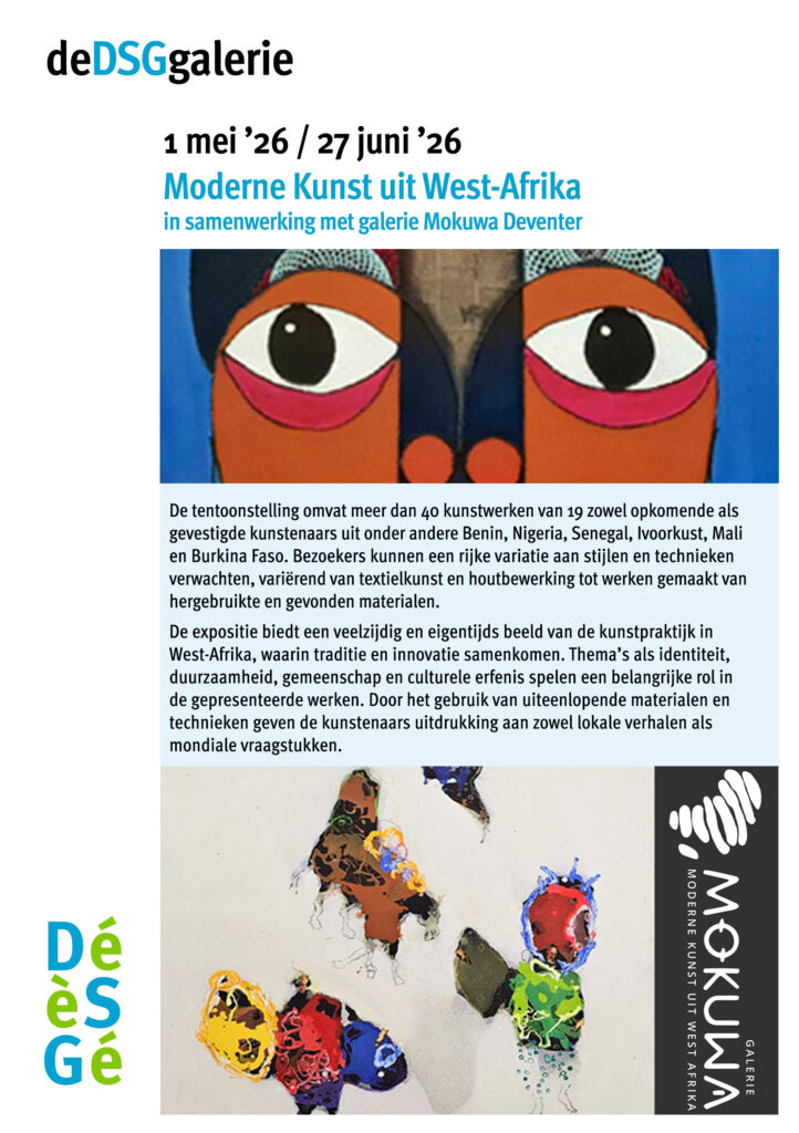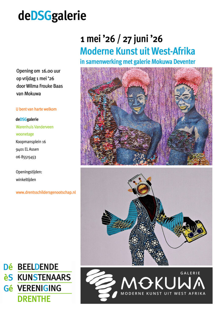Van 1 mei tot en met 27 juni presenteert de DSG galerie in Assen een bijzondere tentoonstelling met hedendaagse kunst uit zes West-Afrikaanse landen. De expositie is het resultaat van een inspirerende samenwerking met Galerie MOKUWA uit Deventer.