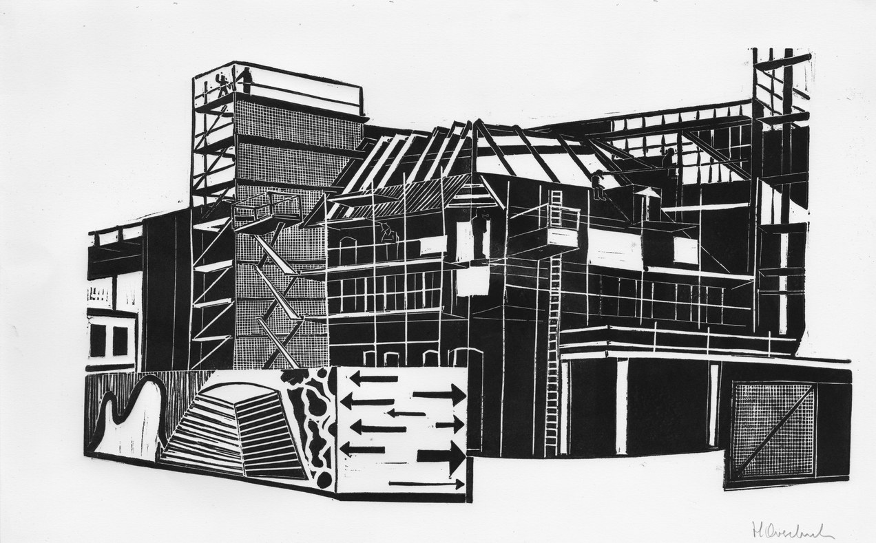| Hein Overbeek, ''Gezicht op Warenhuis Vanderveen tijdens de verbouwing van 2011/12', linoleumsnede, 26 x 42 cm. |