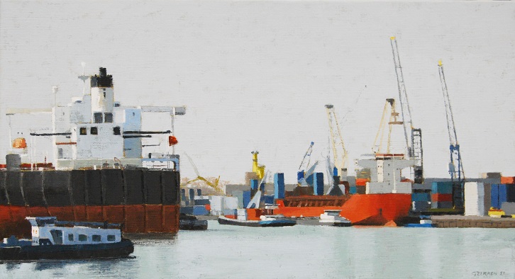 | Gineke Zikken, ‘Haven met oranje schip', olieverf , 60 x 110 cm. |
