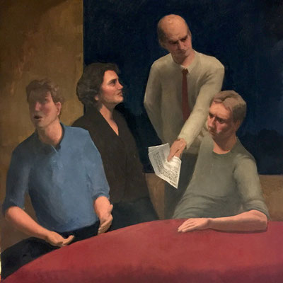 | Reinout Velleman, 'Onrust in de vergaderzaal', 2020, olieverf op doek, 125 x 130 cm. |